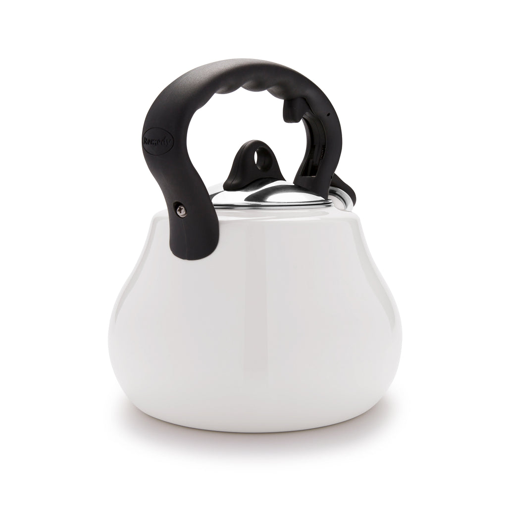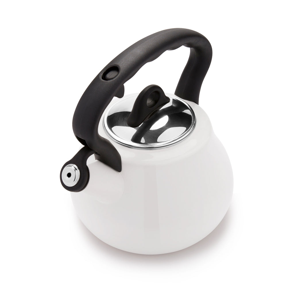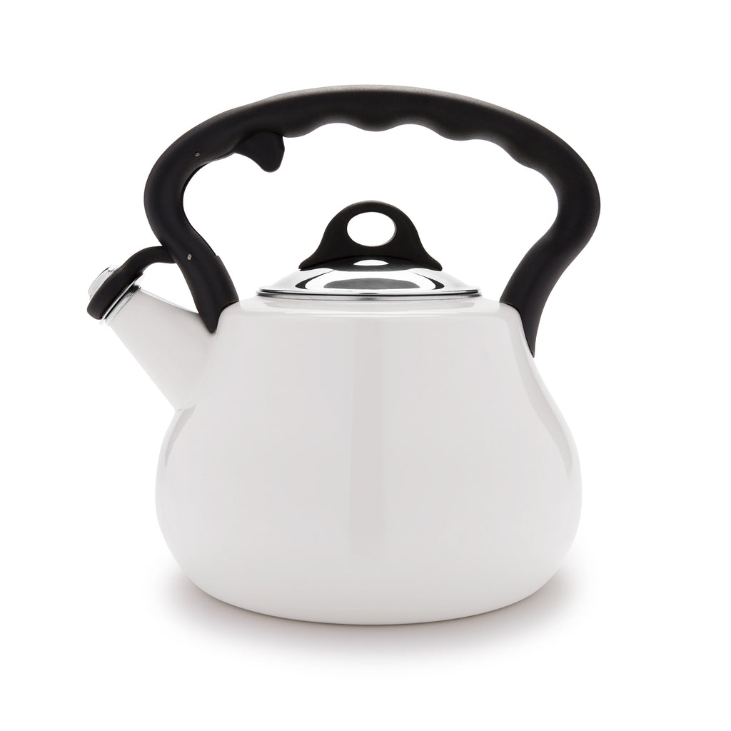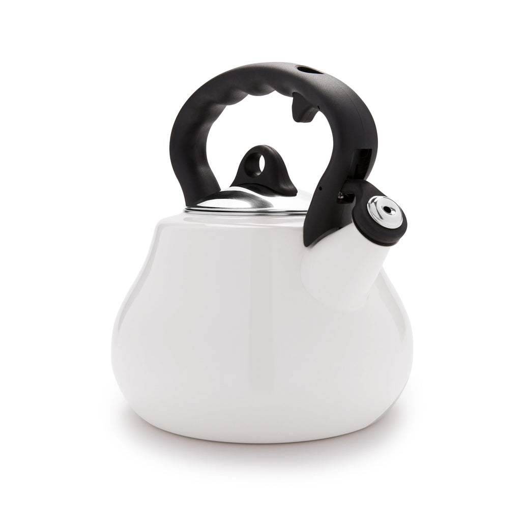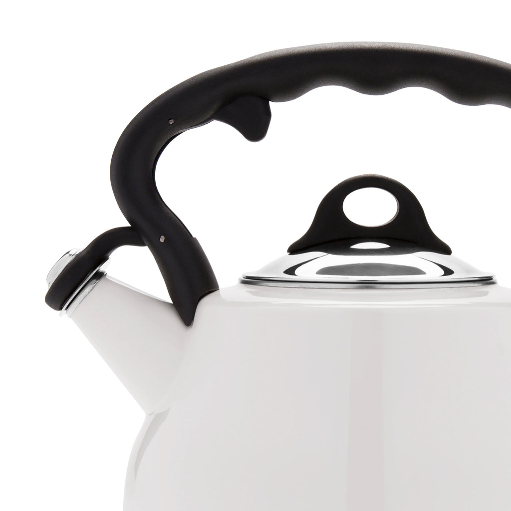 These high-grade porcelain enamel tea kettles boast a sleek, distinctive profile that would look good on any stovetop or kitchen countertop. Kettles have a cool-touch handle with finger toggle that opens and closes the spout for safe, easy use.